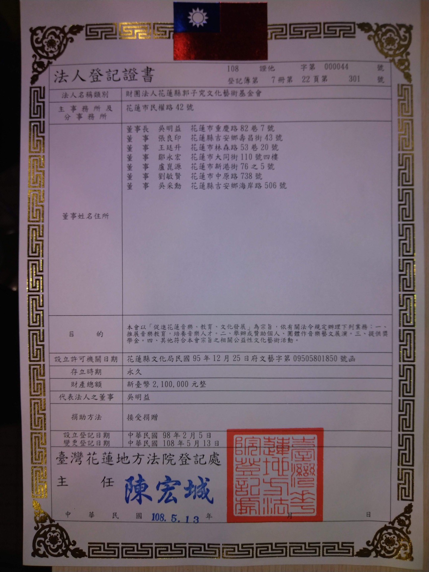 財團法人花蓮縣郭子究文化藝術基金會 證書